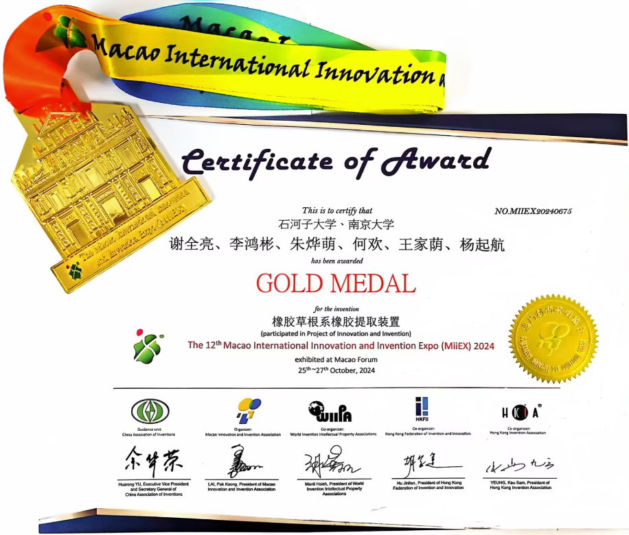 近日,我校生命科学学院李鸿彬教授团队的谢全亮副教授组的一项“橡胶草根系天然橡胶提取装置”发明专利在第十二届澳门国际创新发明展中荣获金奖。该专利以新疆橡胶草作为新疆盐碱地开发利用的能源植物,加速新疆盐碱地使用效率以及盐碱地种植橡胶草高含胶量的改进。展现了橡胶草在橡胶产业以及轮胎市场上应用的巨大潜力。为大规模种植高含胶量橡胶草品种育种和商业化生产应用提供材料基础,也为推进新疆橡胶草快速提取橡胶及检测提供技术支持。