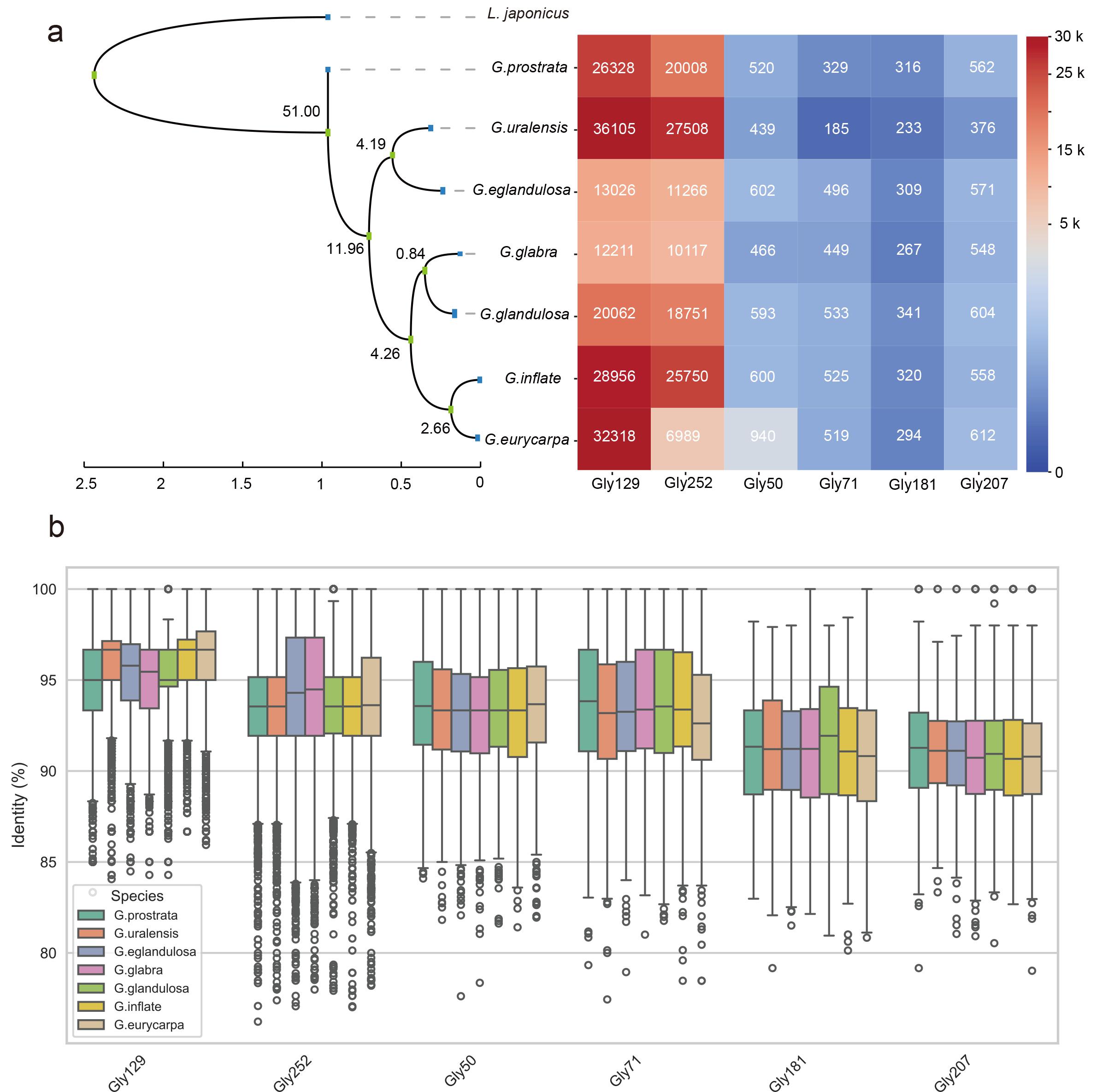 景观图谱显示多个重复序列实际染色体物理定位与基因组中预测位置存在差异(图2),表明复杂重复序列在当前甘草基因组的精准组装仍然面临巨大挑战。此外,研究还着重分析了6个近着丝粒/着丝粒重复序列在7个甘草种间的进化差异和轨迹,发现年轻的Gly252反转录转座子总是偏好插入到与其末端高度相似的Gly129卫星重复区域,并且在甘草物种独立分化后仍保持协同进化模式(图3)。本研究深入剖析了甘草属种间重复序列的结构组成和进化差异,为未来高质量甘草属植物基因组组装和着丝粒演化相关研究提供了重要参考依据。