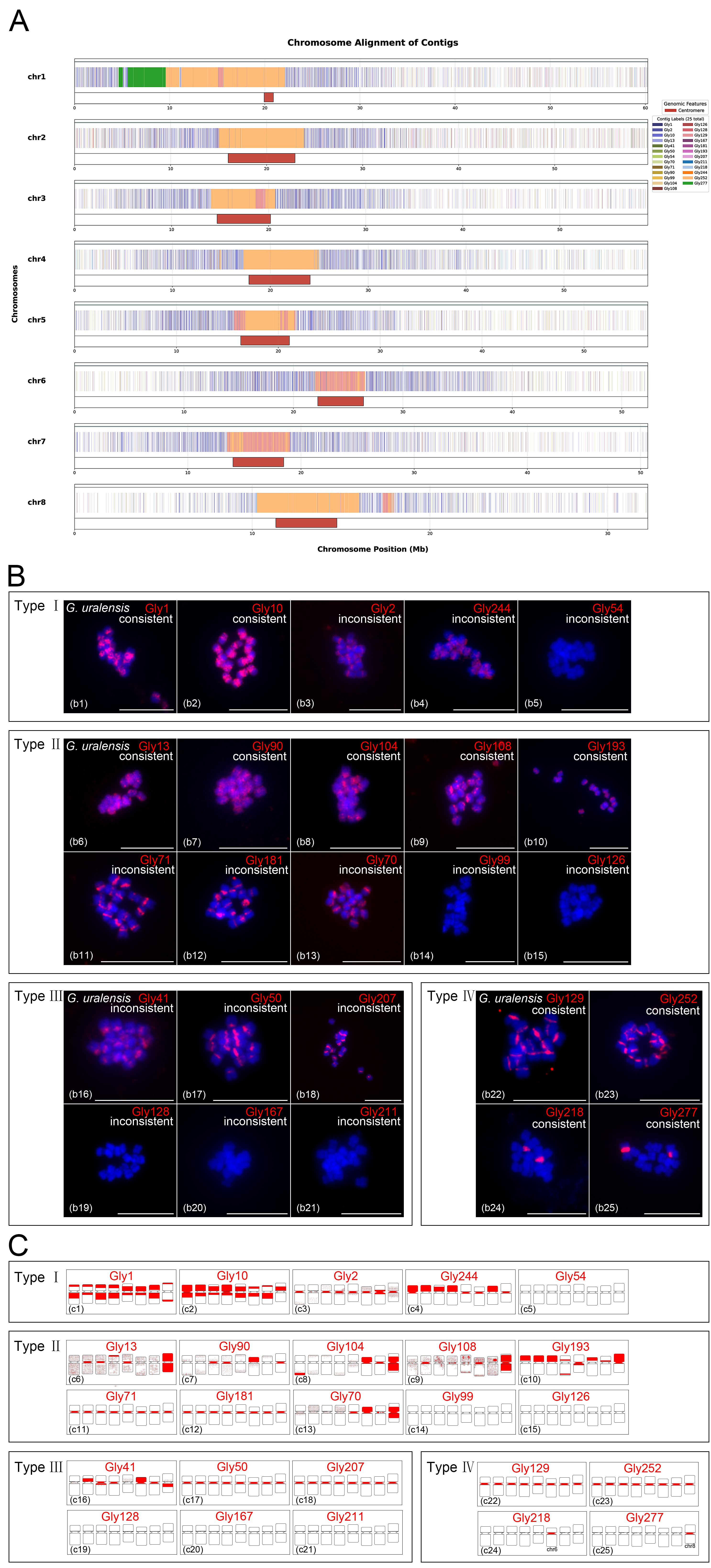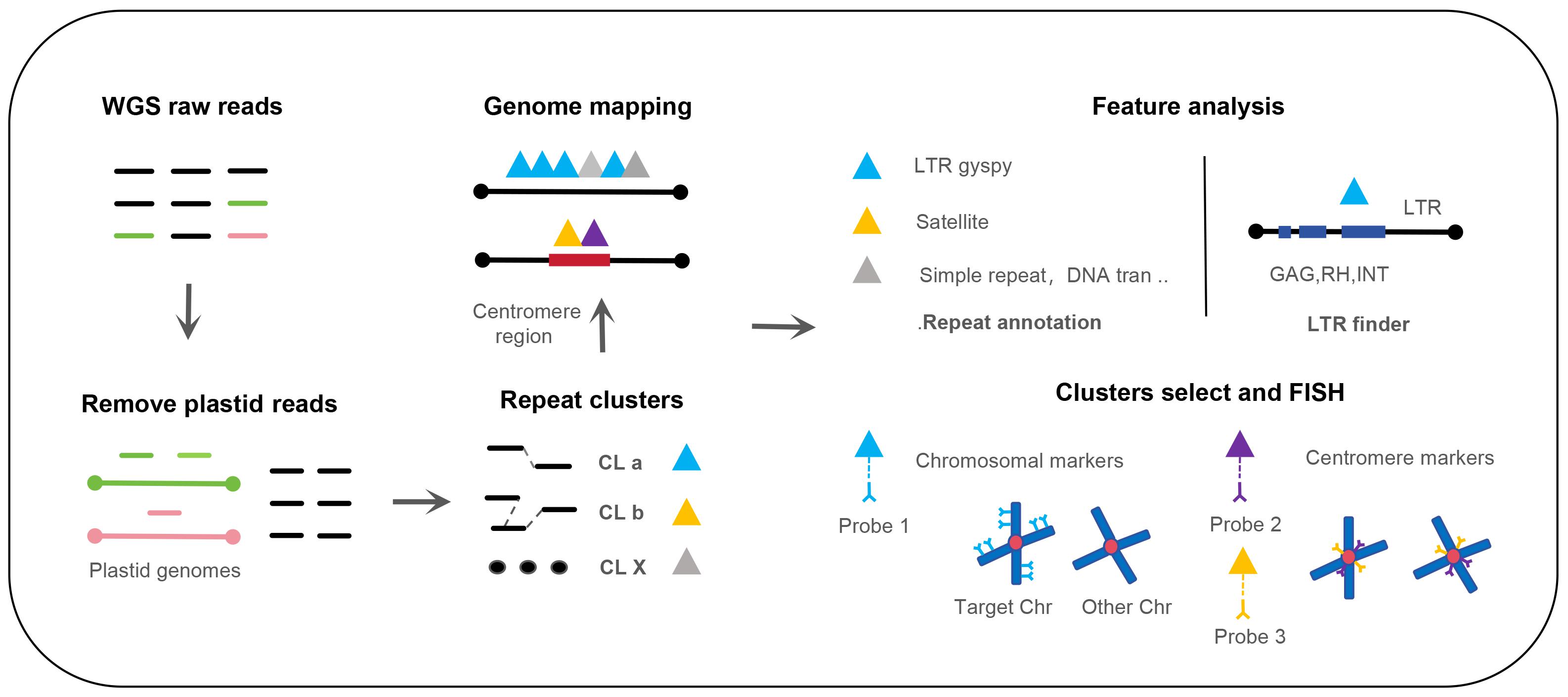 重复序列曾一度被称为“垃圾DNA”,然而随着不断的研究发现,重复序列在生物进化、物种形成及基因表达调控中扮演着至关重要的角色。甘草作为最常用的中草药之一,具有极高的药用价值,素有“国老”之称。甘草基因组中重复序列的占比高达61.7%。然而,目前对甘草属植物重复序列结构组成、进化动态及功能意义知之甚少,这严重阻碍了甘草属重复序列演化及功能研究。针对这一问题,该课题组通过甘草低深度测序组装聚类结合荧光原位杂交技术建立了一套甘草重复序列可视化工作体系(图1),并建立了7种甘草主要重复序列的景观图谱。