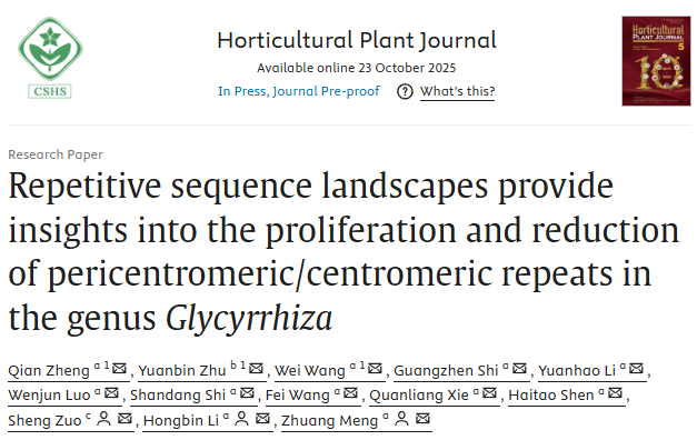 近日我院李鸿彬/孟状研究团队在《Horticultural Plant Journal》(中科院1区TOP)发表题为“Repetitive sequence landscapes provide insights into the proliferation and reduction of pericentromeric/centromeric repeats in the genus Glycyrrhiza”(重复序列景观图谱揭示甘草属近着丝粒/着丝粒区域的进化动态)的原创性研究论文。课题组已于2024年9月在植物学国际权威期刊《The Plant Journal》(中科院1区TOP)发表关于甘草属种间染色体进化关系和物种起源研究,此次研究成果是甘草属植物染色体进化生物学相关研究又一重要新进展。