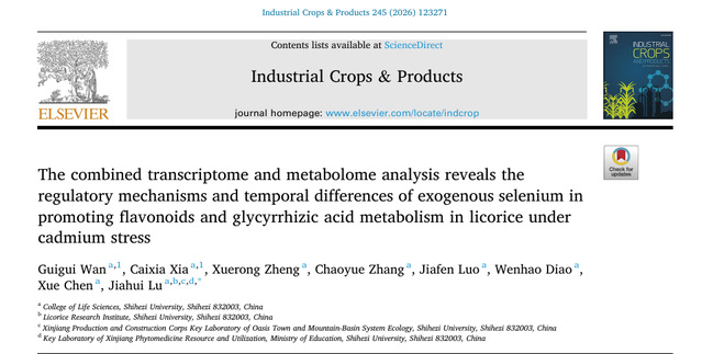 近日,我院陆嘉惠教授甘草研究团队,聚焦甘草主产区土壤镉污染问题,在外源硒缓解甘草镉积累、提升药材品质及其分子调控机制方面取得新突破相关原创性成果以The combined transcriptome and metabolome analysis reveals the regulatory mechanisms and temporal differences of exogenous selenium in promoting flavonoids and glycyrrhizic acid metabolism in licorice under cadmium stress”为题发表在《Industrial Crops & Products》(中科院一区TOP期刊,IF=6.2)。